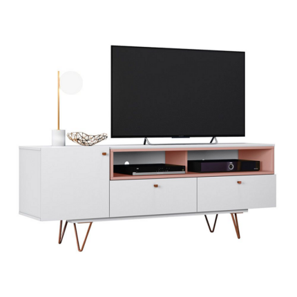 Rack funcional y moderno, compatible con TV de hasta 65″. Incorpora 1 nicho abierto ideal para equipos multimedia, 1 puerta corrediza para almacenamiento discreto y 2 cajones con riel metálico que permiten organizar accesorios con facilidad. Sus patas de madera barnizadas de 17 cm aportan estabilidad y un estilo cálido y elegante al mueble.