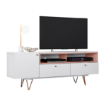 Rack moderno y funcional, compatible con TV de hasta 65″. Incluye 1 puerta abatible con bisagra metálica, 2 cajones con riel metálico y 2 nichos abiertos, perfectos para organizar dispositivos y accesorios. Sus patas metálicas aportan estabilidad y un estilo contemporáneo, mientras que los tiradores de ABS aseguran resistencia y un acabado moderno.